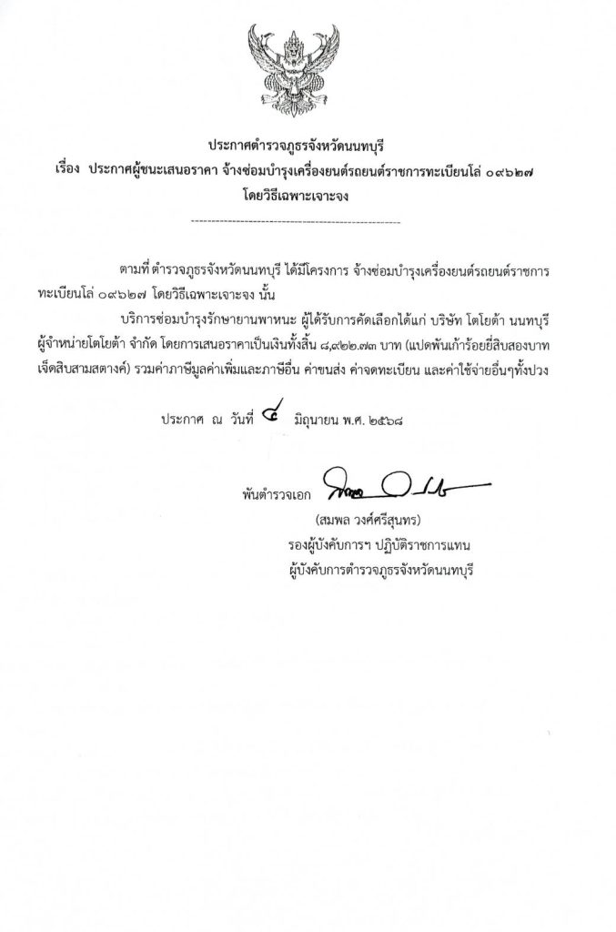 ประกาศผู้ชนะเสนอราคา จัดซ่อมบำรุงเครื่องยนต์รถยนต์ราชการ ทะเบียนโล่09627