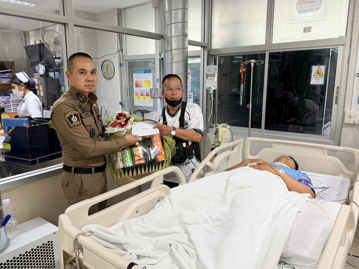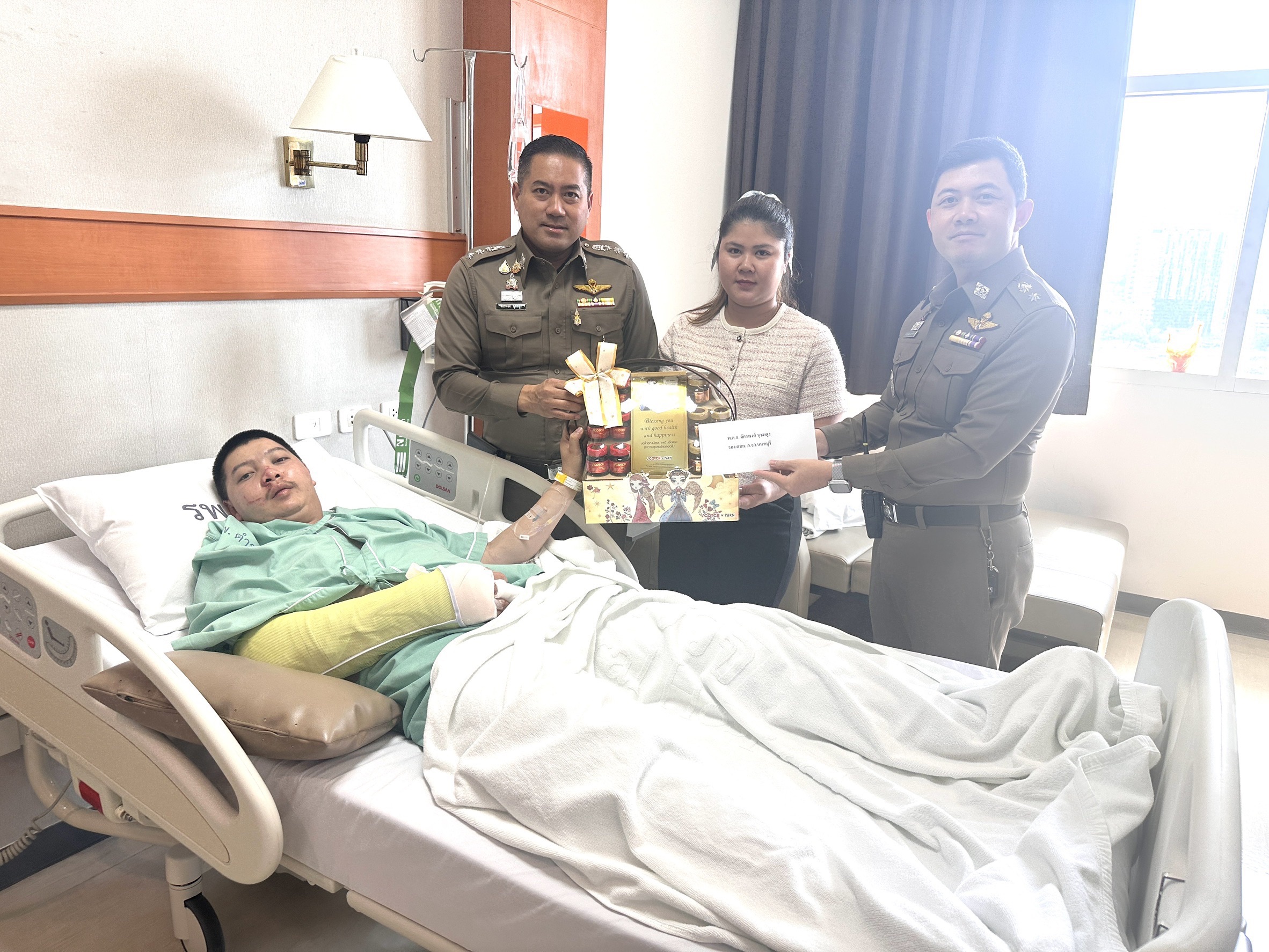 พ.ต.อ.จักรพงศ์ นุชผดุง รอง ผบก ภ.จว.นนทบุรี เยี่ยมให้กำลังใจเจ้าหน้าที่ที่ประสบอุบัติเหตุขณะปฏิบัติหน้าที่
